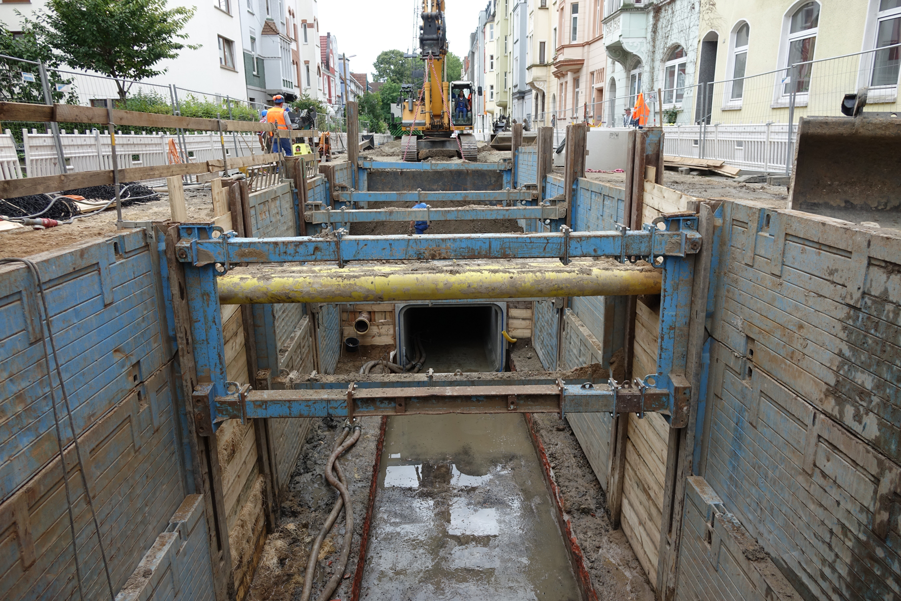 Mit der Planung und Ausführung der in offener Bauweise durchzuführenden Sanierungsarbeiten beauftragt wurden die auf Ingenieurplanung im Kanalbau spezialisierte Borkener H+S GmbH & Co. KG und die ebenfalls in Borken ansässige Klaus Stewering Bauunternehmung GmbH & Co. KG. Für die Sicherung der 5 m breiten und 5,50 m tiefen Baugruben im engen Altstadtbereich von Bielefeld setzt das Tiefbauunternehmen den gestuften Linearverbau von Emunds+Staudinger ein, einer Produktmarke der thyssenkrupp Infrastructure. Neben wirtschaftlichen Vorteilen kann das Verbausystem auf der Baustelle vor allem seine technologischen Stärken ausspielen – und das sowohl in der Handhabung bei Ein- und Ausbau als auch mit Blick auf die statische Leistungsfähigkeit hinsichtlich der engen Wohnbebauung und des breiten Querschnittes der Baugrube.
