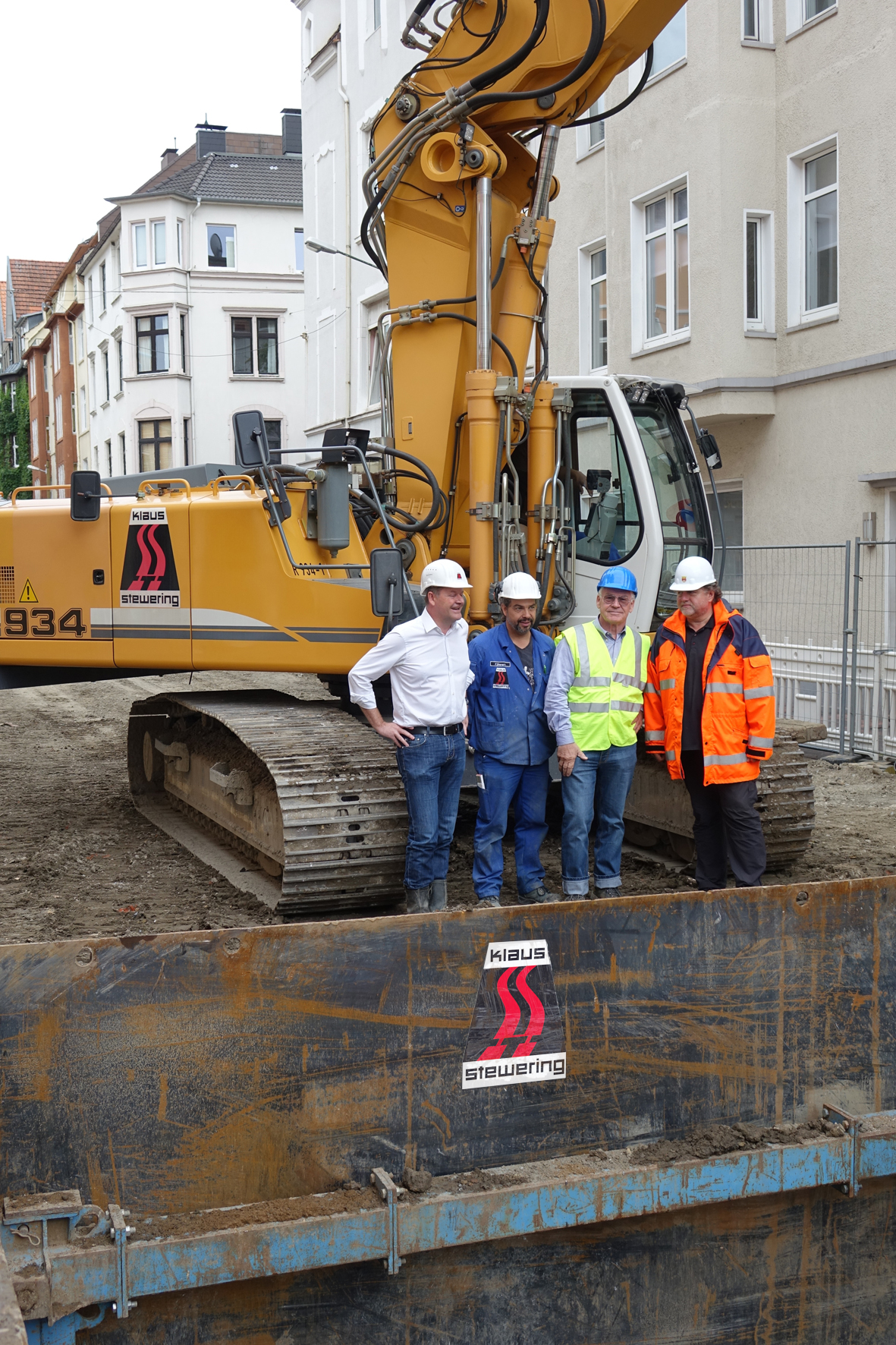 Zur Sicherung der 5 m breiten und 5,50 m tiefen Baugrube setzt die Bauunternehmung auf den Linearverbau von Emunds+Staudinger – „eine Lösung, die sich im Vergleich mit verschiedenen Alternativen als die wirtschaftlichste Option erwiesen hat“, wie Heitkamp betont. Außerdem sind die Anforderungen, welche die Verhältnisse vor Ort an den Verbau stellen, hoch. „Der Einbau großer Profile (2,90m x 2,35m) erfordert einen großen Querschnitt der Baugrube und damit auch den Einsatz von schwerem Gerät“, erklärt Stewering-Polier Frank Stenert. „Zudem liegt der Grundwasserspiegel neben dem Kämpfer, sodass wir das Grundwasser während der Baumaßnahme fassen müssen“, so Stenert.