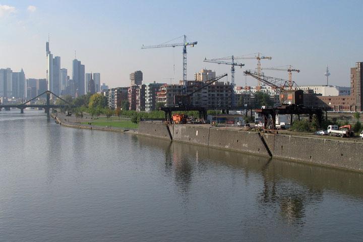 Wo vor einigen Jahren noch Schrottplätze und brachliegende Hafenanlagen das Mainuferbild prägten, schafften vor allem die Neugestaltungsmaßnahmen im Zuge der FIFA WM 2006 Vorbereitungen ein völlig neues Bild. Der für 2007 anstehende Neubau der Europäischen Zentralbank auf dem Gelände der ehemaligen Großmarkthalle beinhaltet die zwingende Forderung die Sanierung des Ostenddükers in 2006 fertig zu stellen, denn das Dükeroberhaupt (und damit der Dükerzugang) liegt im "Umgestaltungsbereich" der Europäischen Zentralbank.