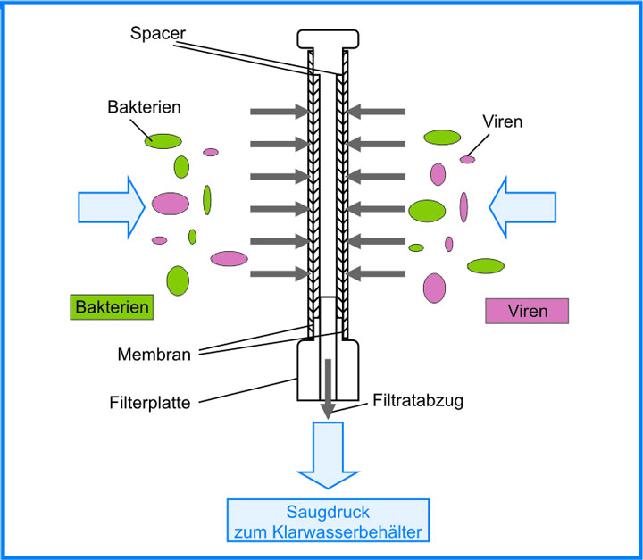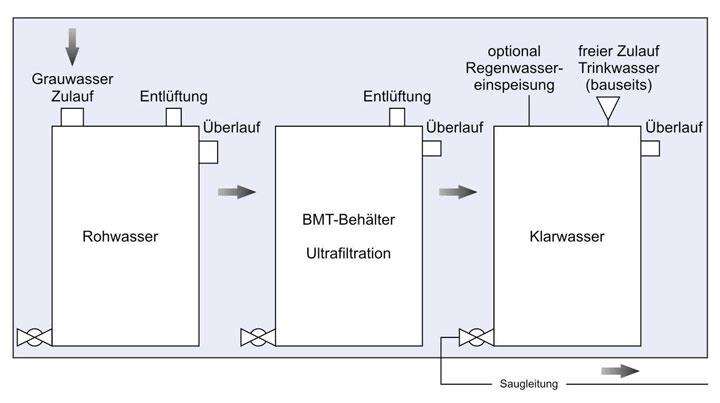 | Technik Grauwasser-Recycling setzt voraus, dass die Grauwasserfraktion der Gebäudeabwässer durch ein separates Leitungsnetz erfasst und der Aufbereitungsanlage zugeführt wird. Die Verteilung des gereinigten Betriebswassers zu den Verbrauchsstellen bedarf ebenfalls eigener Versorgungsstränge. Der Arbeits- und Kostenaufwand für diese installationstechnischen Voraussetzungen ist bei Neubau oder grundlegender Renovierung natürlich am geringsten. Die Grauwasseranlage an sich ist heute bei allen Herstellern als technisch ausgereiftes Serienprodukt im Angebot. Automatikbetrieb ist Standard. Durch modulare Bauweise kann sie auf den individuellen Kapazitätsbedarf zugeschnitten und, falls zu einem späteren Zeitpunkt erforderlich, auch erweitert werden. Aufbau und Funktionsweise ergeben sich aus der Kombination bewährter abwassertechnischer Verfahrensschritte. Sie sind mehreren, hintereinander geschalteten Behandlungskompartimenten zugeordnet, die das Grauwasser sukzessive durchläuft. Nach Abtrennung grobstofflicher Verunreinigungen sedimentieren in einem ersten Behälter die mitgeführten Schwebstoffe. Manche Anlagen pumpen das Sediment automatisch ab und leiten es in die Kanalisation. Im dann folgenden Behandlungsteil findet die biologische Reinigung als kleinräumig konzentrierte Kopie dessen statt, was uns die Natur tagtäglich vormacht. Spezielle Kulturen von Mikroorganismen verstoffwechseln die verbliebene Schmutzfracht, wobei sie sich vermehren und somit als abbauaktive Kultur fortlaufend erhalten. Das nun gereinigte Wasser gelangt abschließend in einen Klarwassertank, der zugleich Vorlagebehälter für die Verbrauchsstellen ist. Der Abzug des biologisch behandelten Wassers vom Bio-Kompartiment in den Klarwassertank erfolgt meist durch Membranfiltration und ist ein weiterer Reinigungsschritt. Eingetaucht in das Bio-Kompartiment saugen Membranmodule von dort sauberes Wasser ab. Die dabei verwendeten Ultrafiltrationsmembranen haben eine so geringe Porenweite, dass sie selbst Bakterien und einen erheblichen Teil der Viren zurück halten. Damit ist eine sichere Hygienisierung des Betriebswassers gegeben. Alternativ kann die Entkeimung auch mit einer UV-Bestrahlung im Ablauf der Betriebswasservorlage erfolgen. Die von einer Grauwasseranlage erzielte Wasserqualität entspricht den Anforderungen der EU-Badegewässerrichtlinie oder übertrifft diese sogar. |