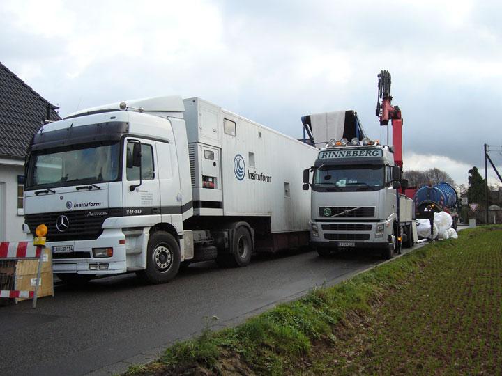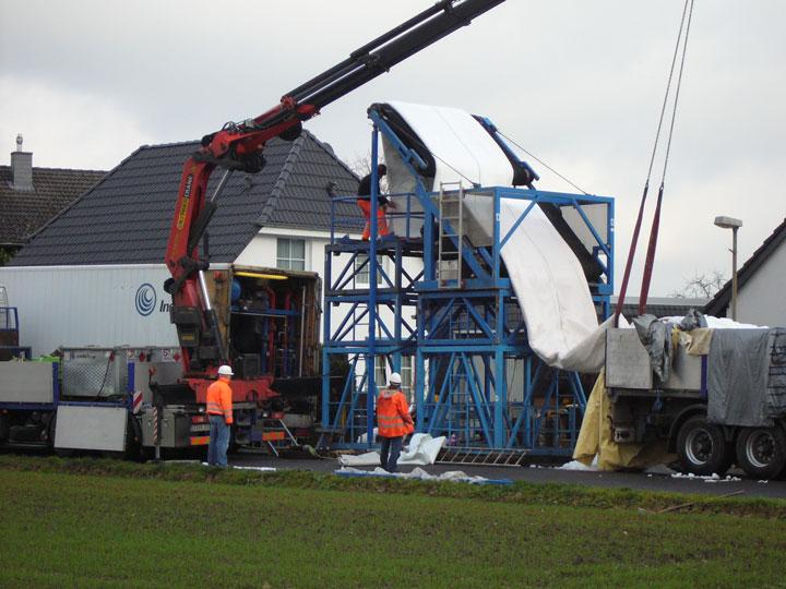 Eine besondere Herausforderung logistischer Natur bestand in der Koordination zahlreicher Schwertransporte in dem relativ beengten Baustellenbereich. Der rund 34 t schwere Schlauch wurde mittels Tieflader in Bergheim angeliefert, wo er von einem Mobilkran auf den Inversionsturm gehoben wurde und von hier über ein Förderband in den Kanal inversiert wird. Als zusätzliche logistische Herausforderung kam hinzu, dass das für den Inversionsvorgang erforderliche Prozesswasser, welches aus der benachbarten 150er Ringleitung entnommen werden sollte, für einen zügigen Schlaucheinbau nicht ausreichte. Ca. 250 m