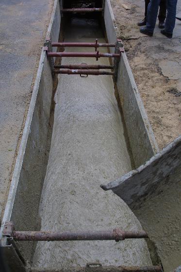 Nach Aushub und Sicherung des Grabens wird der Rohrstrang auf der Grabensohle auf Holzbohlen oder Sandsäcken (letztgenannte sind nach [14] aus statischen Gründen vorzuziehen) entsprechend den Planungsvorgaben ausgerichtet und fixiert (Bild 2a). Vor dem Einbringen des hydraulisch gebundenen Verfüllbaustoffes mit flüssiger Konsistenz, der im Transportbeton-Mischfahrzeug (Fahrmischer) auf die Baustelle angeliefert wird, müssen zur Auftriebs- und Lagesicherung sogenannte Haltungs- oder Belastungsbänke aus dem gleichen Verfüllbaustoff in steifer Konsistenz gesetzt werden (Bild 2b bzw. Bild 3a). Diese werden direkt aus dem Betonmischer über die Betonrutsche oder über Schüttrohre bzw. einen Schlauch, in Ausnahmefällen auch über eine Pumpe, gezielt in Abständen von etwa 2,00 bis 2,50 m zur Ballastierung vorzugsweise auf die Rohrverbindungen aufgebracht.