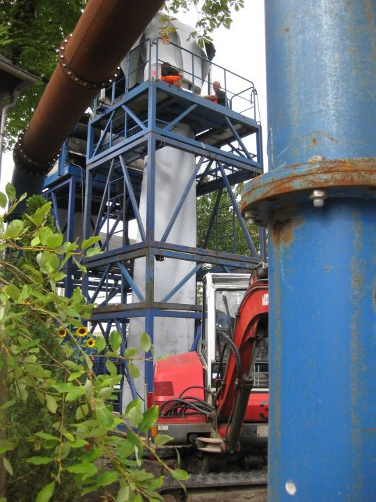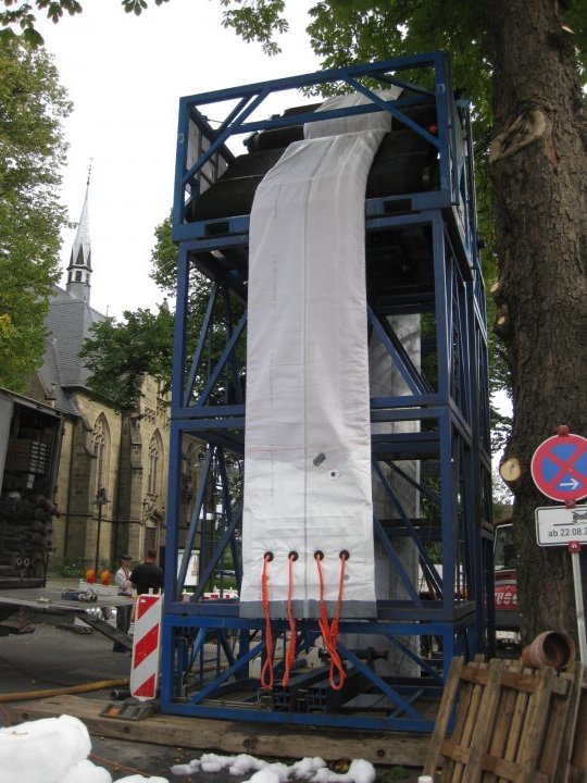 Der erste Einbauabschnitt sah die Inversion gegen, der zweite in Fließrichtung vor. Die Herausforderung bestand neben den Dimensionswechseln und der Durchfahrung der vielen Bögen mit bis zu 45° insbesondere auch in der Festlegung der Höhe der Wassersäule. Hier waren die Insituform-internen Vorgaben gemäß dem Qualitätsmanagement zu beachten und gleichzeitig die geringe Überdeckung des Altkanals von teilweise nur 50cm. Ein zu hoher Innendruck könnte schnell zur unerwünschten Aufweitung des Altrohres und folglich der Straßenoberfläche führen, da die Auflast zu gering wäre: Die Höhe des Gerüstturms (mit ausgeklapptem Förderband) betrug daher 7,70m.