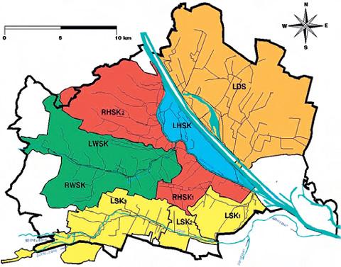 Das Kanalnetz der Stadt Wien hat eine gesamte Länge von ca. 2 200 km bei einer gesamten Fläche der Stadt von ca. 260 km2 und einem mittleren Versiegelungsgrad von knapp 50 Prozent. Die angeschlossene Einwohnerzahl liegt bei ca. 1,8 Millionen In Abbildung 1 sind die fünf Haupteinzugsgebiete mit ihren Hauptsammlern dargestellt. Das durch eine Abflusssteuerung maximal aktivierbare Speichervolumen in den verschiedenen Haupteinzugsgebieten ist in Tabelle 1 zusammengestellt. Damit ergibt sich ein spezifisches Speichervolumen von 72 m³/ha für das gesamte Wiener Einzugsgebiet. Unter Berücksichtigung eines Abschlags von 50 Prozent für Stauraumkanäle verbleibt immer noch ein spezifisches Speichervolumen von 36 m³/ha, das dem Stand der Technik für derartige Gewässer entspricht.