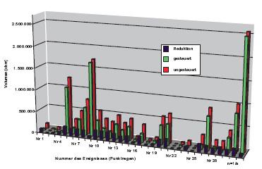 | Einzugsgebiet | Speichervolumen [m3] | Versiegelte Fläche [ha] | Spezifisches Speichervolumen [m3/ha] | Anzahl der Steuerungspunkte | ||
