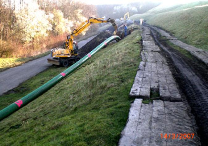 Im Auftrag der EMSCHERGENOSSENSCHAFT und des LIPPEVERBANDS als Körperschaften des öffentlichen Rechts begannen die Tiefbauer der Firma Kanal- und Rohrtechnik GmbH bereits im Februar 2006 mit der Erneuerung der Deichfußdrainage des Lippedeiches als Subunternehmer für die Ausführung des Berstlining-Verfahrens. Bis April 2007 wurden insgesamt mehr als 2.000 Meter Polyethylen- und Polyprophylenrohre in den Dimensionen da 340 – da 560 größtenteils in der geschlossenen Bauweise eingebracht. Da die gesamte Baustelle im Böschungsbereich liegt, waren Spezialfachkräfte bei der Planung und Ausführung gefragt.