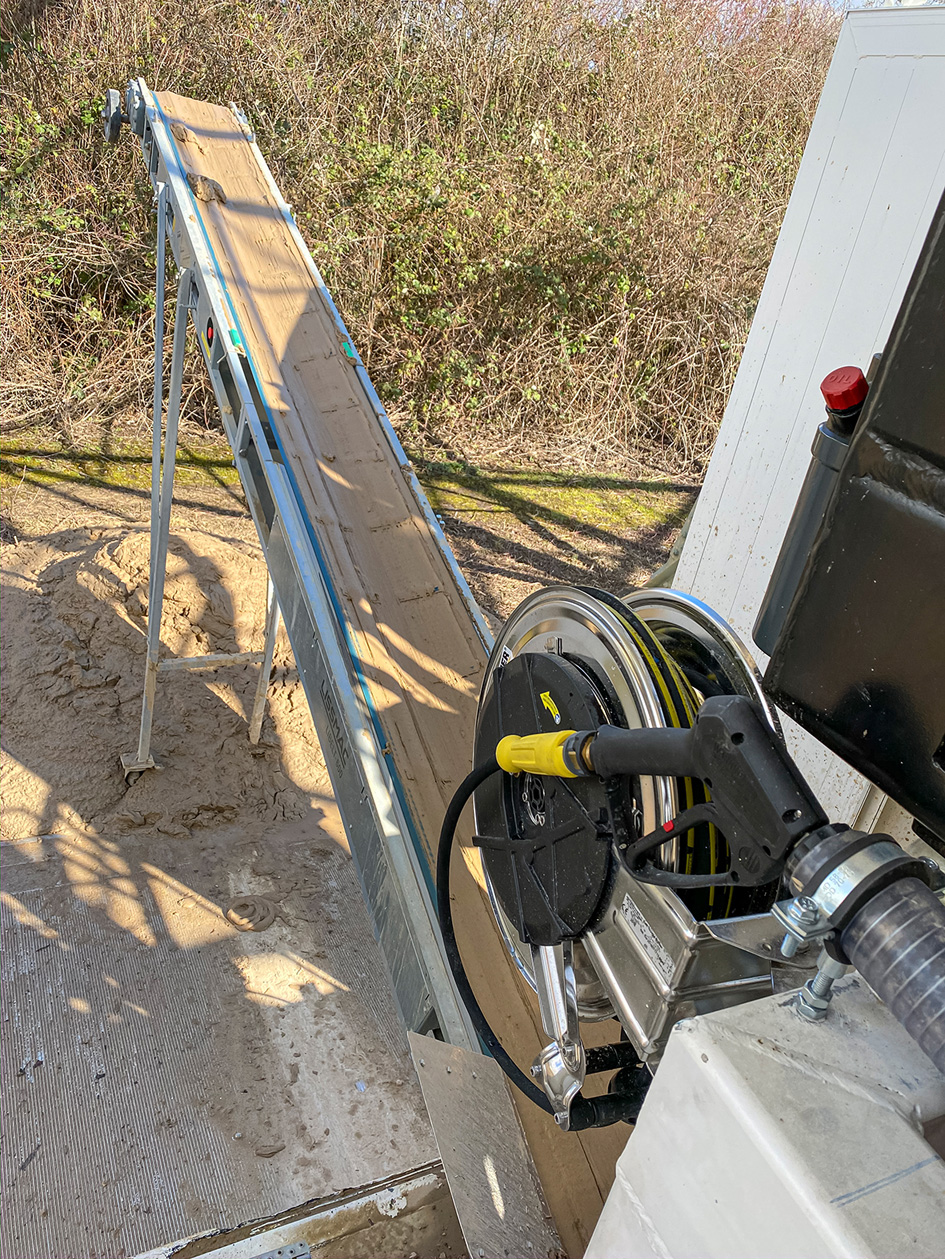 Ebenso ungewöhnlich und nicht bei Serienmodellen zu finden, ist ein am Heck des LKW fest installiertes schwenkbares Förderband, mit dem die im Recyclingprozess abgeschiedenen Feststoffe direkt in Container, auf LKW, in eine Radladerschaufel o.ä. gefördert oder als Haufwerk hinter dem Recycling-LKW abgelagert werden können.