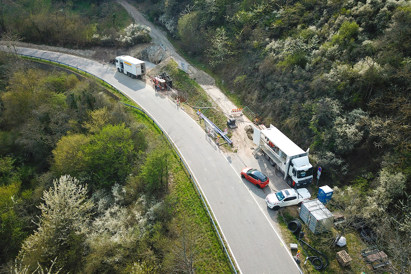 Die Felsbohrungen wurden mit einer Ditch Witch® AT30 im Schieferfels durchgeführt. Da entlang der schmalen Kreisstraße die notwendigen Baustelleneinrichtungsflächen sehr knapp bemessen waren, konnte die Recyclinganlage direkt mit der Bohranlage gekoppelt werden und lief autark ohne Verwendung einer weiteren Mischanlage als Puffer. Hierbei zeigte sich deutlich, dass sich der Einbau eines Venturi-Mischsystems als richtig erwiesen hatte.