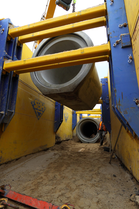 Auch die werkseitig, in einem speziellen Verfahren hergestellten Tangentialschächte entsprechen den hohen Anforderungen der Auftraggeber. So entsprechen sie DIN EN 1917 und DIN V 4034-1 sowie der FBS- Qualitätsrichtlinie Teil 2.1. Das speziell entwickelte Verfahren für einen monolithisch hergestellten Tangentialschacht beeindruckte den Entscheider nachhaltig. Als Aufbaumaterial kamen Schachtteile mit integriertem, einteiligem Dichtungssystem TOP SEAL VARIO zum Einsatz mit Spezialdichtungen in NBR. Insgesamt wurden über 2 km schalungserhärtete PERFEKT Rohre mit Fuß und 18 Tangentialschächte mit Krümmer für das Bauvorha- ben gefertigt. Entscheidend bei der Wahl des Lieferanten für die Auftraggeber war die gleichmäßig hohe Qualität der Produkte, deren Leistungsfähigkeit sowie das Know How und die Erfahrung von BETONWERK BIEREN bei der Herstellung. "Ich bin beeindruckt von der Qualität und dem hohen Niveau der Rohr- und Schachtfertigung im Betonwerk Bieren", so Prof. Dipl.- Ing. Volker Westphal von der Ingenieurgesellschaft Masuch + Olbrich aus Oststeinbek bei einem Besuch im Werk in Bad Oeynhausen. Auch der zuständige Projektleiter des Hamburg Airport zeigte sich beeindruckt von der Produktpalette. "Unser Projekt ist bei Ihnen in sicheren Händen", so Dipl.- Ing. Martin Helf bei seinem Besuch im Betonwerk. Um die geplante Bauzeit einzuhalten, wurden aus zwei Werken der UNTERNEHMENSGRUPPE ERDBRÜGGER, in eng vorgegeben Zeitfenstern, Rohre und Schächte für das Flugplatzgelände geliefert und verbaut.