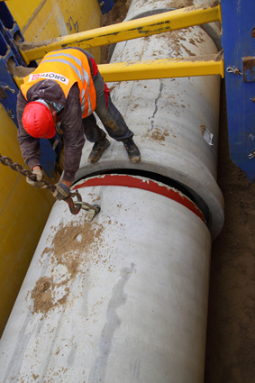 Um den hohen Standards für Hamburg gerecht zu werden, waren folgende Auflagen zu beachten: Alle Stahlbetonrohre mussten nach DIN EN 1916 Typ 2 und DIN V 1201, in schalungserhärteter Form PERFEKT, in FBS-Qualität und mit einer Kerosin- und Enteisungsmittelbeständigen Dichtung aus NBR gefertigt sein. Die Eigen- und Fremdüberwachung musste dokumentiert sein. Die speziellen NBR-Dichtungen, Nitril-Butadien-Kautschuk, eignen sich aufgrund ihrer Robustheit für diesen Anwendungsbereich besonders gut. Die DS Dichtungstechnik GmbH, Nottuln, entwickelte dieses spezielle Dichtungssystem, das gegenüber chemischen Angriffen, wie durch Kerosin oder Enteisungsmittel, resistent ist. Weiterhin weisen NBR-Dichtungen eine hohe Elastizität auf und sind temperaturunempfindlich. Ebenso haben diese Dichtungen ein günstiges Alterungsverhalten sowie eine hohe Abriebfestigkeit. Für die Baumaßnahme Hamburg Airport sind über 2 km FBS-Stahlbetonrohre mit Fuß in 3,00 m Länge, mit Sonderbewehrung für BFZ 750, in DN 300 bis DN 1400 hergestellt worden. Das PERFEKT Rohr ist in der Schalung erhärtet hergestellt und mit einem integrierten Dichtungssystem Ankerplus L in NBR-Qualität versehen. Alle Rohre entsprechen der DIN EN 1916 Typ 2 und DIN 1201 in FBS Qualität, nach der FBS-Qualitätsrichtlinie Teil 1.1. Sie gilt für FBS-Betonrohre, FBS-Stahlbetonrohre, FBS-Vortriebsrohre und zugehörige FBS-Gelenkrohre und FBS-Passrohre Typ 2 mit Kreisquerschnitt nach DIN EN 1916 und DIN V 1201, die von FBS-Mitgliedsfirmen hergestellt werden und das FBS-Qualitätszeichen tragen. Das FBS-Qualitätssicherungssystem mit seiner umfassenden Werkseigenen Produktionskontrolle (WPK) stellt eine für Rohrwerkstoffe einmalige und lückenlose Qualitätskontrolle von den Ausgangsstoffen über die Herstellung bis zu den Endprodukten sicher. Im Rahmen der halbjährlichen Fremd- überwachung durch bauaufsichtlich anerkannte Güteschutzgemeinschaften oder Prüfinstitute, wird die Erfüllung der Norm- und FBS-Anforderungen kontrolliert und bewertet.