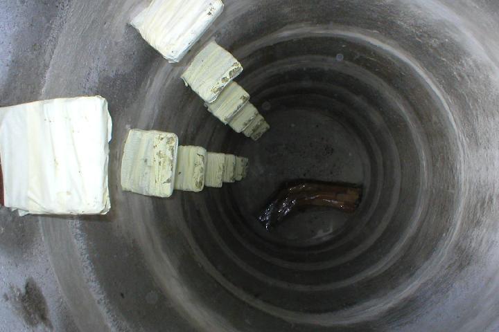 Die Schachtsanierung erfolgte im modernen KS-ASS Verfahren. Die einzelnen Arbeitsschritte werden im Folgenden kurz besprochen: Zunächst wurde der Abwasserschacht mit der TSSR, einer zur Maschinenausrüstung des KS-ASS Verfahrens gehörenden Turbo-Schacht-Spezial-Reinigundsdüse grundgereinigt. Die TSSR wird hierfür jeweils auf den vorhandenen Schachtdurchmesser eingestellt und abgestimmt, um eine gleichmäßige, gründliche und effektive Reinigung der Schachtwandung zu erzielen. Ein manuelles Nachreinigen der Wände ist erfahrunggemäß in der Regel nicht mehr erforderlich. Die vorhandenen Steigeisen waren in Sonthofen in einem einwandfreien Zustand, so dass diese nur abgeklebt werden mussten, um sie vor der späteren Mörtelbeschichtung zu schützen. Durch die fachgerechte, gründliche Reinigung konnten sämtliche manuellen Vorarbeiten, wie z.B. punktuelle bzw. flächige Abdichtung oder Reprofilierungen bedarfsgerecht ausgeführt werden. Es überraschte nicht, dass durch ERGELIT Kombina 10 schnelldicht die starken Wassereinbrüche innerhalb von 2 Stunden gestoppt werden konnten. Zwei Mitarbeiter arbeiteten am Schacht. Einer gab von oben den Mörtel an und sicherte seinen Kollegen im Schacht, der undichte Muffen mit dem effektiven ERGELIT Kombina 10s spezial schloss. Bei dem genannten Material handelt es sich um einen zementgebundenen, durch organische und anorganische Zusätze vergüteten, hochfrühfesten 1-komponentigen Beschichtungs- und Sanierungsmörtel. Der Grundwasserstand war am Sanierungstag zwar relativ niedrig. Da die zu sanierenden Schächte aber in Wasserwechselzonen stehen, wurden die Schachtfugen vorsorglich mit dem Trockenmörtel ERGELIT Kombina 10s spezial behandelt.