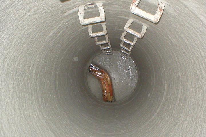 Der niedrige Grundwasserstand begünstigte alle Arbeitsschritte. Jetzt erfolgte das Anschleudern des ERGELIT Sanierungsmörtels nach dem KS-ASS Verfahren. Ein über eine Pumpe mit dem Spezialmörtel ERGELIT Kombina KS1 beschickter, rotierender Schleuderkopf wird im Kanalschacht so auf und ab gefahren, dass die Schachtwandung mit der erwünschten Schichtdicke des Mörtels saniert wird. Mit dem ca. 5000 Umdrehungen rotierenden Schleuderkopf wird der Frischmörtel hoch verdichtet. Die im beschriebenen Fall aufgetragenen 10 mm Mörtel wurden innerhalb von 35 Minuten aufgetragen.