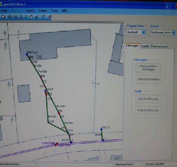 Zur Verifizierung der Genauigkeit beim Einsatz von „Geo-ASYS“ wurden im Vorfeld die im Testgebiet liegenden zugänglichen Entwässerungselemente topografisch vermessen. Die Vermessungsdaten der Entwässerungselemente (Revisionsschächte) wurden in die digitale Stadtgrundkarte eingepflegt. Durch diese Vorgehensweise wird jede vor Ort mit „Geo-ASYS“ durchgeführte Vermessung während der Inspektion des Anschlusskanals überprüfbar. In der nachfolgenden Darstellung wird sichtbar, welche Fortschritte in Bezug auf die Genauigkeit der Verlaufsmessung erreicht wurden.