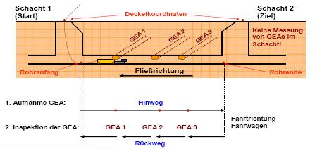 - Beim Abschluss der Untersuchung einer jeden Grundstücksentwässerung wird von dem am weitesten entfernten Punkt zum Anschluss bei der Rückwärtsfahrt eine Kontrollmessung zur Überprüfung der erhobenen Vermessungsdaten durchgeführt.