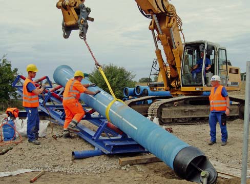 Zum Spülbohren nutzte die Firma Beermann Bohrtechnik GmbH aus Zeitz ein Bohrgerät mit einer Zugkraft von 1.000 kN. Die erste Bohrung mit 200 mm war innerhalb eines Tages abgeschlossen, auf Hindernisse sind die sechs Arbeiter des Steinfurter Unternehmens nicht gestoßen. Im zweiten Gang wurde die Bohrung auf 750 mm und schließlich auf 920 mm aufgeweitet. Durch dieses Bohrloch wurde mit schwerer Technik der Strang aus neuen, je sechs Meter langen Rohren DN 500 eingezogen. Die Einzelrohrmontage der BLS®-Rohre DN 500 wurde von der Baufirma Josef Pfaffinger Leipzig Baugesellschaft mbH durchgeführt. Zur Einführung der Rohre in das Bohrloch unter einem angestrebten Eintrittswinkel von 11° diente eine Montagerampe (Bild 2). Die Baugrube war etwa 15 m lang. Vor dem Einzug wurde die Verbindung der duktilen Gussrohre mit einer Schrumpfmanschette und einem Stahlblechkonus geschützt.