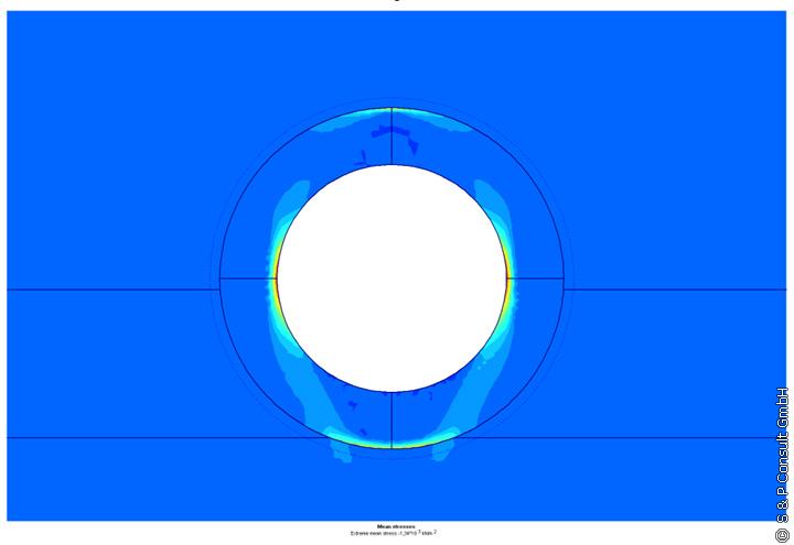 Die maximal auftretenden Druckspannungen im Mauerwerk lagen oberhalb der zulässigen Druckspannungen (s. Bild 6). Die Standsicherheit für den Berechnungsquerschnitt des Altkanals konnte nicht nachgewiesen werden, so dass sich der Kanal im Altrohrzustand III befand; d.h. er ist ohne abstützende Wirkung des umgebenden Erdreiches nicht mehr ausreichend tragfähig. Für die geplante Sanierung des Großprofils war demnach eine statische Ertüchtigung erforderlich.