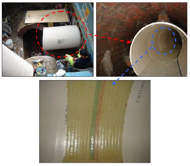 Die Sanierung erfolgte zunächst im Bereich der beiden Kurvenbauwerke mit Wickelrohrsegmenten, welche auf der Baustelle an die Kurvengradiente angepasst wurden (s. Bild 8 oben). Die Stoßfugen zwischen den einzelnen Segmenten (bis zu 2 cm breit) wurden mit einem Handlaminat, bestehend aus einem harzgetränkten ECR-Glasgewebe (s. Bild 8 unten), abgedichtet, um einen Dämmeraustritt bei der Verdämmung des Ringraumes zu verhindern. Diese Arbeiten erfolgten aus einer Baugrube für einen zusätzlich geplanten Betriebsschacht (s. Bild 9).