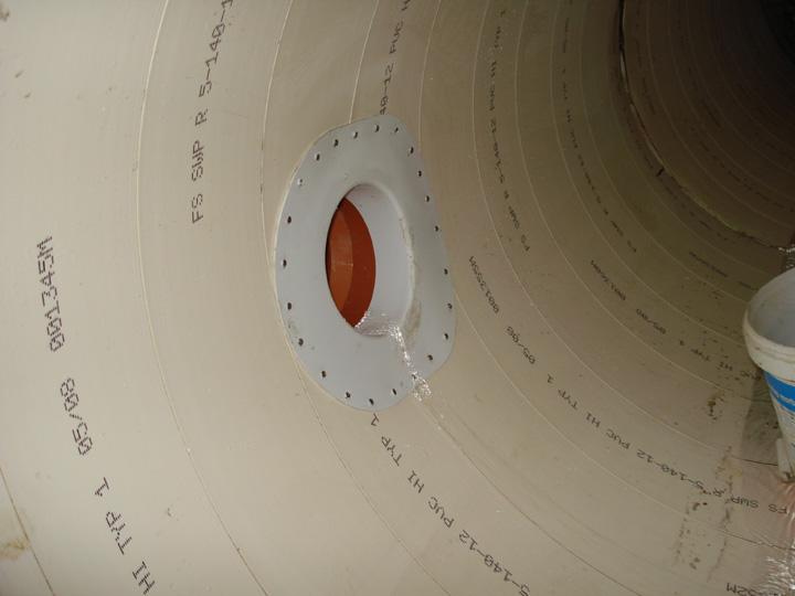 Nach Erreichen des Zielschachtes wurde der Liner gegen Auftrieb gesichert, der verbleibende Ringraum an den Schachteinmündungen abgeschlossen und mit einem Dämmer gemäß den statischen Anforderungen verfüllt (s. Bild 10). Die Anbindung der vorhandenen Anschlussleitungen DN 150 erfolgte unter Verwendung von Hutmanschetten (s. Bild 11a). Die Hutmanschetten, bestehend aus gleichem Material wie das SWP - Wickelrohr, wurden mit dem PVC-Stegprofil kalt verschweißt (verklebt) und zusätzlich mit Edelstahlschrauben fixiert. Das Einbinden eines Zulaufkanals DN 500 erfolgte durch eine dauerhaft dichte und kraftschlüssige Injektion mit einem kunststoffmodifizierten Mörtel (s. Bild 11b).