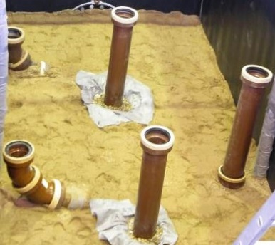 Für die Systemprüfungen in Fall 1 "Stutzen-Einbindung im Liner-sanierten Hauptkanal" wurden im IKT-Großversuchsstand zwei Betonrohrstränge (DN 300) mit Betonschächten (DN 1000) eingebaut, in die jeweils ein Schlauchliner aus GFK bzw. Nadelfilz eingezogen wurde. Jeder Rohrstrang wurde in sechs Abschnitte unterteilt, sodass jeder Anbieter jeweils einen mit drei Schadensbildern (Anschluss DN 150 Steinzeug) ausgestatteten Abschnitt in beiden Rohrsträngen sanieren konnte.