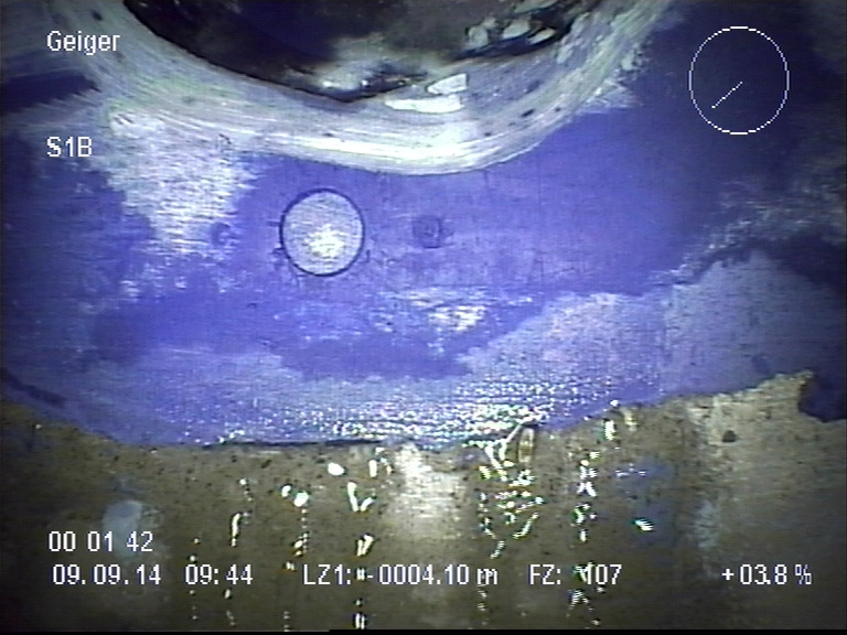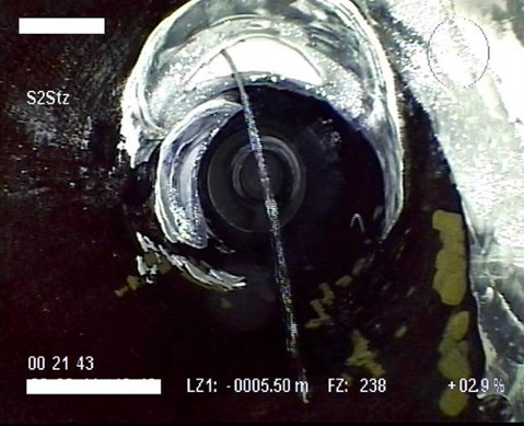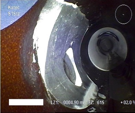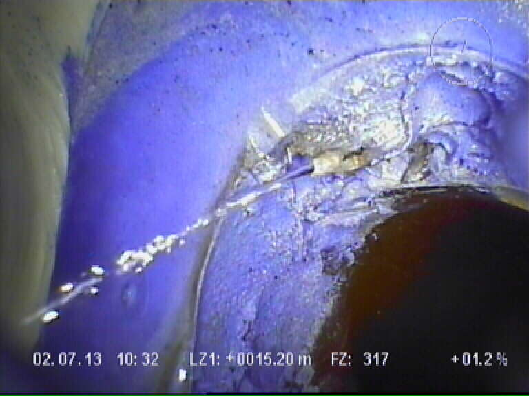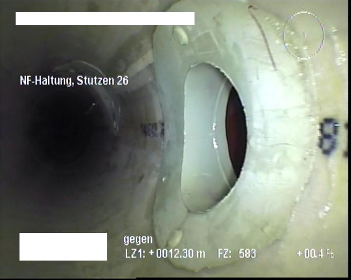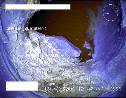 Nach Abschluss der Kanalreinigungsarbeiten fanden sich im nicht-sanierten Hauptkanal (Stutzen-Reparatur) keine Veränderungen. Am Liner-sanierten Hauptkanal (Stutzen-Einbindung) konnten zwar vielfach Materialabplatzungen festgestellt werden, diese hatten allerdings keinen besonderen Einfluss auf Dichtheit und Funktionsfähigkeit der sanierten Stutzen.