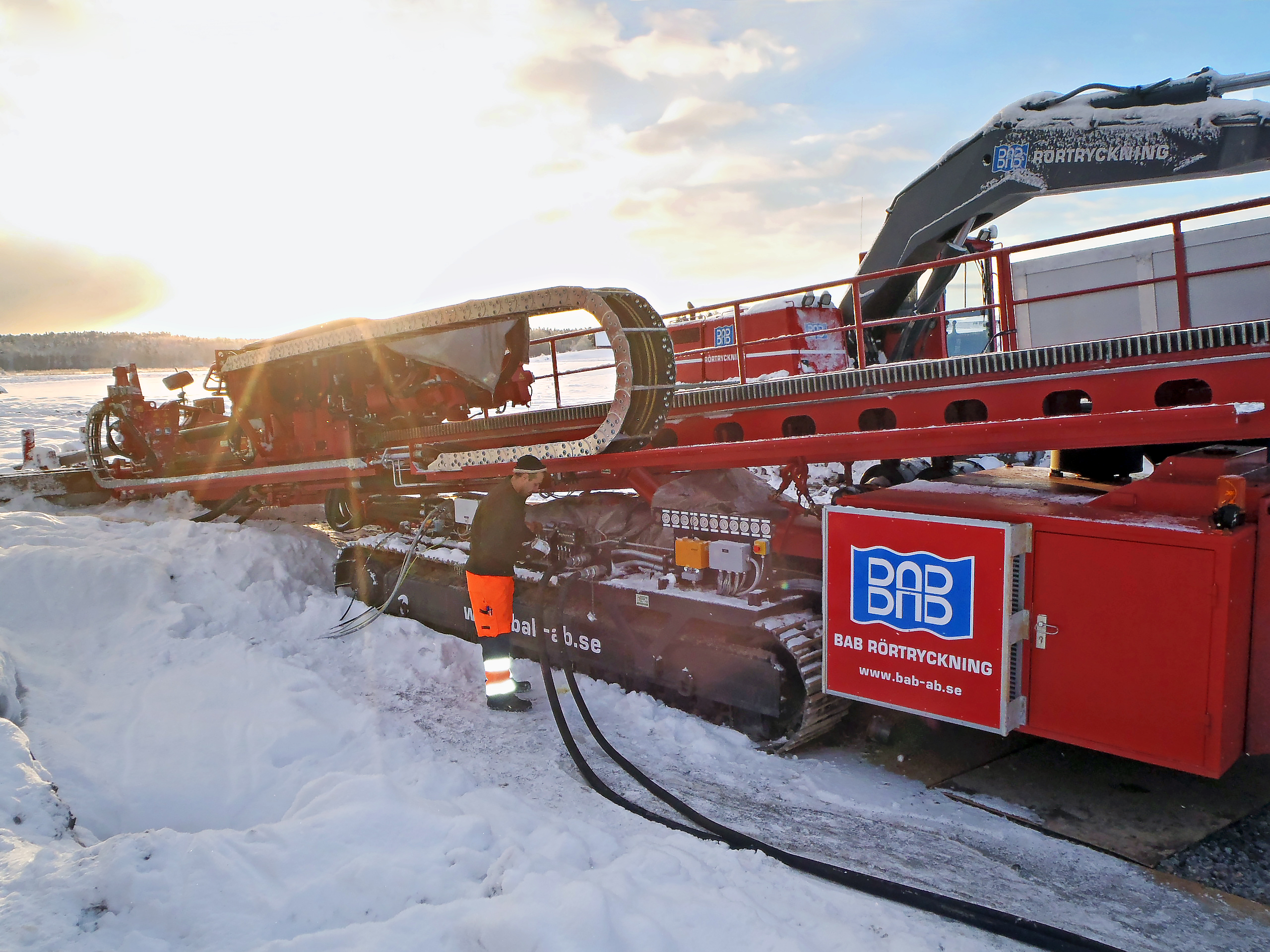 Rund 70 Kilometer nördlich von Stockholm kämpfte sich im vorigen Winter eine Mannschaft des schwedischen Bohrunternehmens BAB Rörtryckning AB durch zentimeterdickes Eis. Der Auftrag: Zwei Abwasser- und eine Trinkwasserleitung mussten unter dem See Länna Kyrksjö verlegt werden. Sie dienen zur Versorgung der unweit gelegenen Gemeinde Norrtälje, deren Leitungsnetz aufgrund des starken Wachstums der Stadt zukünftig zusätzlich mit Wasser aus dem westlich gelegenen Mälarensee versorgt werden soll. Als Bohrtool nutzte BAB Rörtryckning ein Horizontalbohr-Rig (HDD-Rig) vom Typ HK150C von Herrenknecht mit 150 Tonnen Zugkraft.