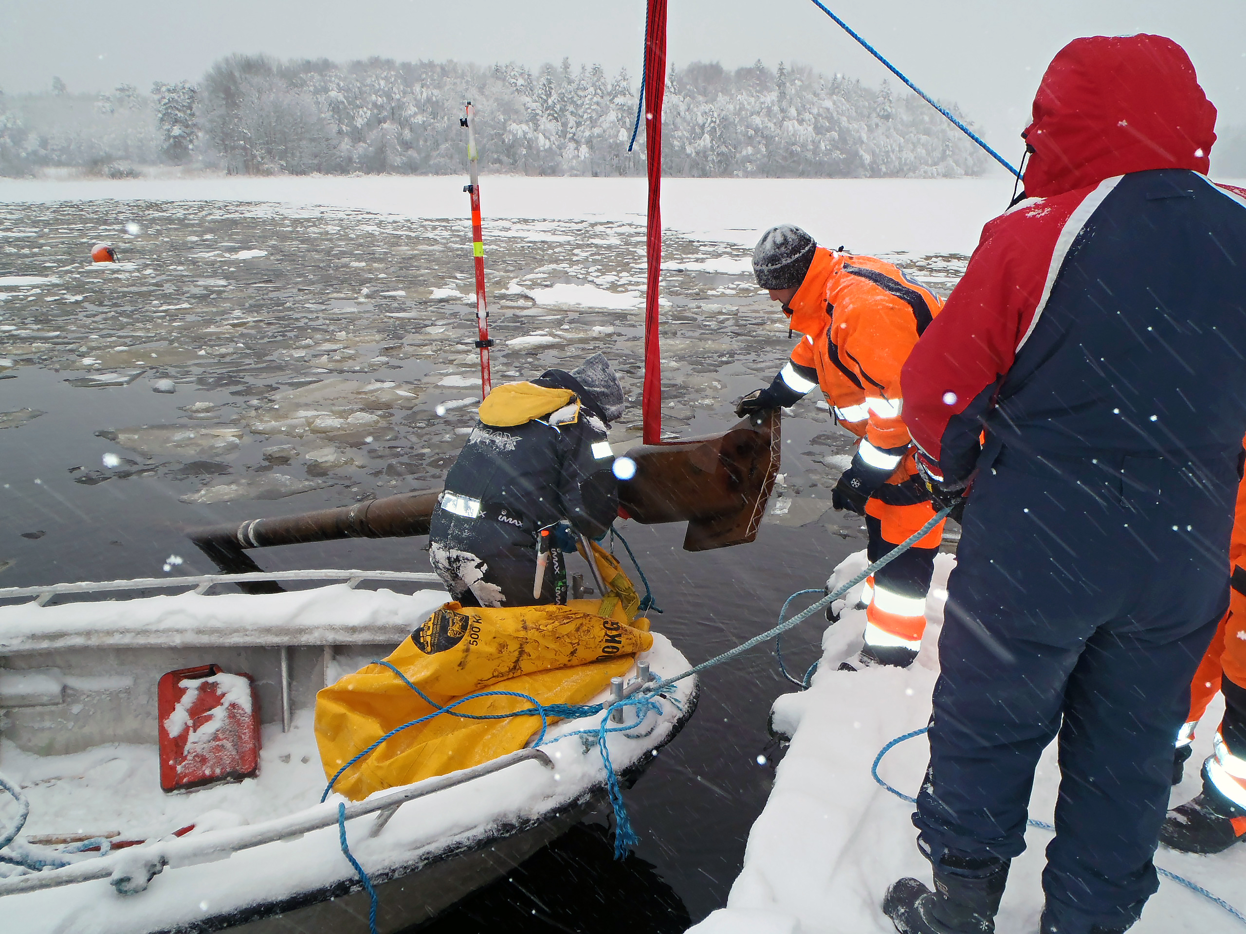 Die erste Bohrung für die Trinkwasserleitung führte vom Ufer aus auf den Grund des Sees. Dort sollte die Rohrleitung mit einer konventionell verlegten Pipeline verbunden werden und so die Verbindung zum gegenüberliegenden Ufer herstellen. Nach nur 2 Bohrtagen war die 700 Meter lange Pilotbohrung auf den Grund des Sees abgeschlossen. Dann schlug das Wetter radikal um. Das Thermometer fiel um 25 Grad, der Auftraggeber SVEAB war plötzlich mit einem 10 Zentimeter dick zugefrorenen See konfrontiert. „Ganze zwei Wochen haben wir rund um die Uhr gegen das Eis gekämpft. Tag und Nacht waren bis zu vier Boote auf dem See als Eisbrecher im Einsatz.“ erinnert sich Magnus Tingstrand von BAB Rörtryckning AB. Die Boote mussten das Eis durchbrechen, um den Bohrkopf bergen, gegen einen Räumer tauschen und die ebenfalls im Eis festgefrorene Pipeline anhängen zu können. Die Mühe lohnte sich – rechtzeitig vor Weihnachten konnte die 28-Zoll-Leitung sicher verlegt werden.