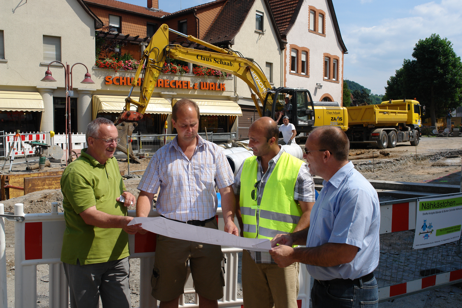 Besonders auf der Baustelle im Graben war den Tiefbauern jede Erleichterung bei der Arbeit willkommen, denn die örtlichen Rahmenbedingungen stellten selbst die Experten vor eine Herausforderung. Schaab: "In puncto Tiefbau war das ein regelrechter Abenteuerspielplatz. Wir mussten auf denkmalgeschützte Gebäude mit empfindlichen Fundamenten Rücksicht nehmen. Hinzu kamen viele querende Leitungen und zahlreiche Fehlanschlüsse." Auch der Baugrund war in schlechtem Zustand. Um die sensible Bausubstanz der Häuser im Baufeld nicht zu gefährden, mussten die Tiefbauer die Baugrube mit Flüssigboden verfüllen, da ein Verdichten auf herkömmliche Weise zu starke Erschütterungen bedeutet hätte. Noch vor Beginn der Kanalbaumaßnahme hatten Experten zur Sicherheit den Ist-Zustand der Häuser dokumentiert und dort Messgeräte installiert.