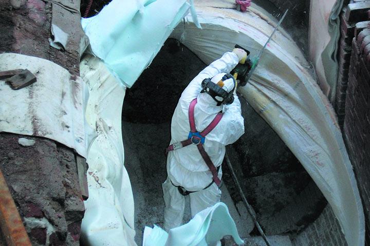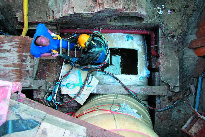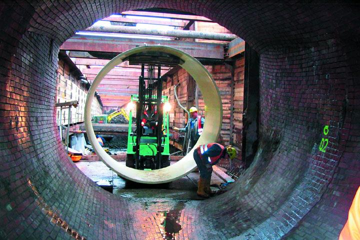 Nicht zuletzt um die enormen Schlauchgewichte handeln zu können, bediente man sich bei Insituform Rohrsanierungstechniken - wie bei den vorangegangenen Dükersanierungen auch - der Doppelinversionstechnik. In die zu sanierende Haltung wird zunächst mit einer Winde der so genannte Einziehschlauch eingezogen. Anschließend wird ein zweiter Schlauch in den Einziehschlauch in der klassischen Inversionstechnik mit Wasserdruck eingestülpt. Damit wird der Einziehschlauch gleichzeitig aufgestellt und an die Altrohrwand gepresst.