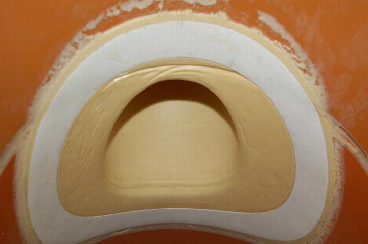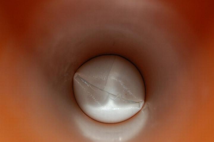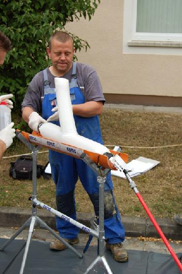 Zunächst wurde die Glasfaser-Hutmanschette mit dem epros Kurzlinerharz getränkt und dann auf den mit Trennmittel eingestrichenen Packer-Finger gestülpt, so dass die Hütchenkrempe fest auf dem Packer-Korpus lag. Im Gegensatz zu den bekannten Packern verfügt der eprosLCR-B-Packer über einen seitlichen Finger, der sich später in den Zulauf hineinstülpt. Zum Einführen über das Hauptrohr muss dieser natürlich "eingefahren" werden. Dies geschieht mittels einer speziell entwickelten Reversionstechnik, wobei das Glasfaser-"Hütchen" bis zur Krempe invers mit eingestülpt wird. Ein dünner Bindedraht fixiert den eingestülpten Finger für den Transport. Er löst sich später, sobald Druck auf den Packer gegeben wird.
