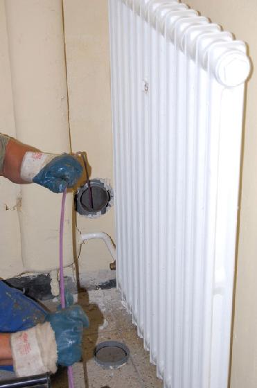 "Vor dem Setzen des Hütchens empfehlen wir immer einen Probelauf. Das heißt, eine simulierte Positionierung des Packers und das Setzen des Hütchens", so Stefan Mühlin. Auf diese Weise könne die Einschubtiefe des Packers an den Stangen markiert werden und ein letztes Mal überprüft werden, ob Durchmesser und Winkel des Packers zur Rohrgeometrie passen. Der Rest ist nach kurzer Übung kinderleicht: Der Kameramann dirigiert den Packer in die exakte Position. Auf Kommando wird nun langsam Druck auf den Packer gegeben. Durch die Bindedrahtfixierung wird zunächst die Hutkrempe im Hauptrohrbereich des Stutzens angedrückt, bevor sich der Bindedraht löst und sich der Finger in den Zulauf inversiert - fertig. Nach ca. 90 Minuten Aushärtung wird der Packer entfernt und das Ergebnis kann mit der Kamera begutachtet werden.