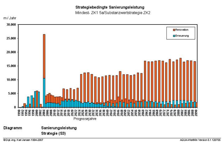 Hierzu sollte unter Verwendung der vorhandenen Stammdaten des Netzinformationssystems und der aus der bisherigen Eigenüberwachung bekannten Netzzustände von rd. 523 km eine Hochrechnung auf das Gesamtnetz von rd. 1.629 km unter Einbeziehung der nicht inspizierten Kanäle mit dem statistischen Prognosemodell AQUA-Selekt Version 3.0b, jetzt 4.0, [1] vorgenommen, eine Prognose und Kalibrierung der Netzalterung mit dem Alterungsprognosemodell AQUA-WertMin 6.1 [2] durchgeführt, Wiederbeschaffungswert und Abnutzungsvorrat (Substanzwert) der Kanalisation bestimmt und mögliche Sanierungsszenarien untersucht werden.
