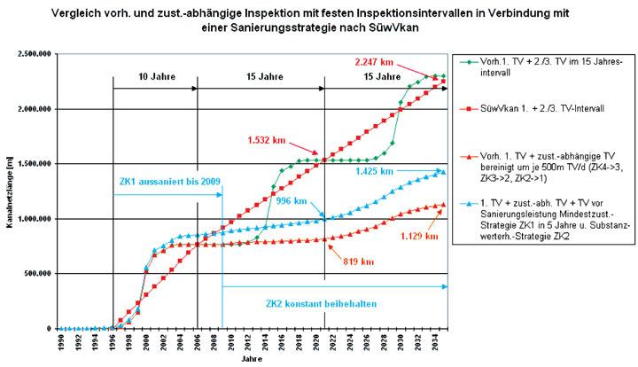 Die Zielerreichung sollte vorrangig mit einer vorbeugenden Sanierungsstrategie in Form einer Mindestzustandsstrategie für die Zustandsklasse 1 (DWA ZK 0) in fünf Jahren und danach mit einer Substanzwerterhaltungsstrategie (Status quo) für die Zustandsklasse 2 (DWA ZK 1) (siehe nachfolgendes Bild) unter Einbeziehung einer prognostischen (ausfallprognoseorientierten) Kanalinspektion realisiert werden.