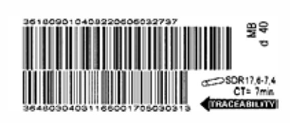 Die Kennzeichnung des Formstücks ist durch entsprechende Regelwerksvorgaben definiert. Dauerhaft lesbar sein müssen grundsätzliche Informationen, wie Herstellerangabe, Rohr-Nenndurchmesser, Werkstoffbezeichnung, SDR-Reihe und Herstellungscharge. Baustellenrelevante Angaben können auf separaten Etiketten (z.B. Barcode-Label) erfolgen, wie z.B. die Schweiß- und Rückverfolgbarkeitsparameter, der SDR-Verarbeitungsbereich für Rohre und die erforderliche Abkühlzeit nach der Schweißung.
