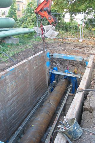 Im sicheren Abstand zu den Gleisanlagen wurde die 2,5 m x 8 m große Startgrube bis zu einer Sohlentiefe von 3,5 m ausgehoben. Nach der termingerechten Lieferung des Bohrgerätes und der dazugehörenden hydraulischen Kraftstation richtete ein Bohrmeister von Emunds+Staudinger die Maschine in der Startgrube ein. Jetzt konnte mit der Pilotbohrung mittels CCD-Kamera und Teodolit begonnen werden. Hierbei musste ein Betonfenster von der Größe 1 m x 1 m mittig getroffen werden. Nach dem Einbau des ersten Vortriebsrohres wurde der Bohrschlitten zurückgefahren und das nächste Vortriebsrohr angesetzt und dreilagig verschweißt, um ein Eindringen von Wasser in das Schutzrohr dauerhaft zu verhindern. Oberbauleiter Dipl.-Ing. Jürgen Finger, Streicher GmbH Tief- und Ingenieurbau, zeigte sich vom weiteren Ablauf der Bohrung regelrecht beeindruckt und war erstaunt, "wie leicht und reibungslos sich der Bohrkopf durch den Untergrund unter dem Gleiskörper fraß."