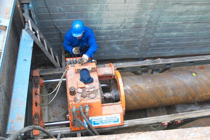 "Wir haben dem Kunden mit dem Bohrgerät BPU 600/800 ein leistungsfähiges Gerät zur Verfügung gestellt, das über eine interessante technische Neuerung verfügt," stellt Frank Görke, Produktmanager Bohrtechnik, Emunds+Staudinger GmbH, sachlich fest. Hierbei handelt es sich um die Steuerung mit Hohlbohrschnecke, die mehrere Vorteile bietet. Besonders hervorzuheben ist die Tatsache, dass die Pilotbohrung beim Auftreffen auf ein Hindernis überbohrt und zurückgebaut werden kann. Nach der Beweissicherung und Beseitigung des Hindernisses können Pilot- und Bohrarbeiten fortgesetzt werden. "Ein entscheidender Vorteil, da zeit- und kostenintensive Arbeiten wie das Ausschachten einer weiteren Startgrube sowie das Bohren einer neuen Trasse entfallen", so Görke weiter. Ein Aspekt, der entscheidend dazu beitragen kann, dass die wirtschaftlichen Rahmenbedingungen einer Baumaßnahme eingehalten werden. "Da ein Rückbau des Piloten in der Maschine möglich ist, ist letztendlich theoretisch auch die Herstellung einer Zielgrube nicht nötig", nennt Görke einige Vorzüge des Systems. Auch die auftretenden Vorschubkräfte auf den Pilotgestängen entfallen beim Überbohren. Einer der wichtigsten Vorteile für den Anlagennutzer: Auf ein Drucklager, welches ursprünglich dazu dient, beim Herausschieben der Piloten ein Mitdrehen zu verhindern, kann ebenso verzichtet werden, wie auf so genannte Aufweitstufen.