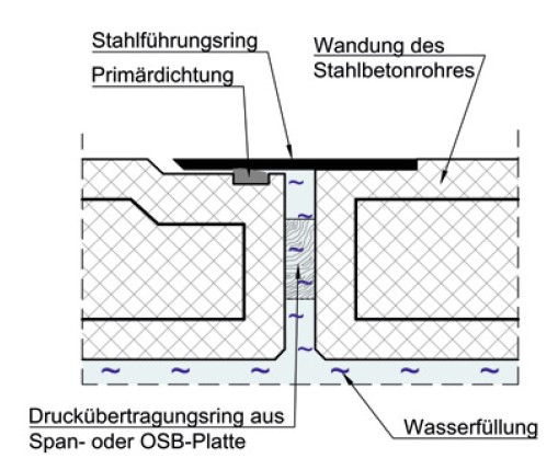 Nach Abschluss des Rohrvortriebs mit Stahlbetonrohren bleibt in den Fugen zwischen den beiden Rohrspiegeln stets ein Spalt bestehen, durch den Abwasser bis zur Hauptdichtung und damit auch bis zum Stahlführungsring vordringen kann. Der Druckübertagungsring aus Holz, Span- oder OSB-Platten stellt keine Dichtung dar, da der Druckübertragungsring insbesondere in Kurven vom Betonspiegel abheben kann (klaffende Fuge, s. Abb. 1) und darüber hinaus der Werkstoff im Laufe der Jahre verrottet.