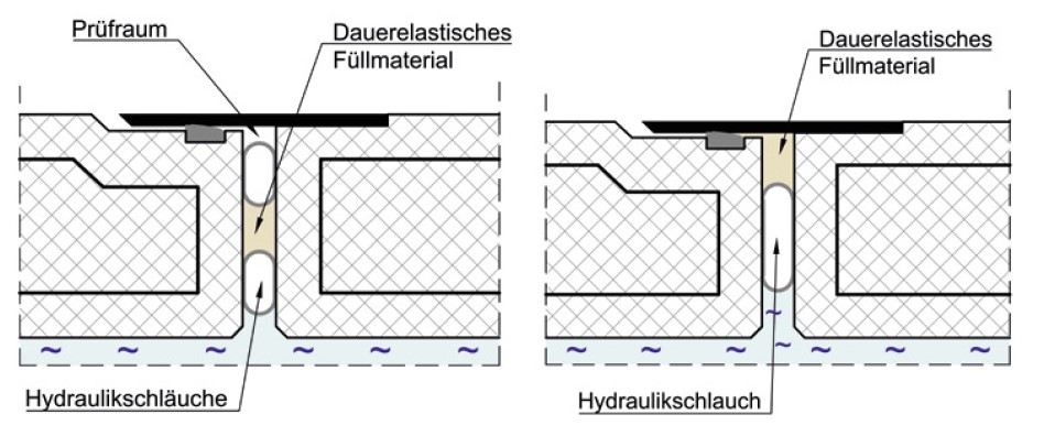Die neueste Entwicklung auf dem Gebiet der inneren Fugenverschlüsse stellt der Hydraulikschlauch dar, auf den ein sogenannter Dichtungsschlauch verrutschsicher aufgespannt wird (s. Abb. 4). Dieser im Gegensatz zum Hydraulikschlauch unbewehrte Schlauch aus einem Elastomer mit deutlich geringerer Shore-Härte stellt eine kraftschlüssige und auch formschlüssige Verbindung zwischen dem harten Hydraulikschlauch und der rauen Betonoberfläche her.