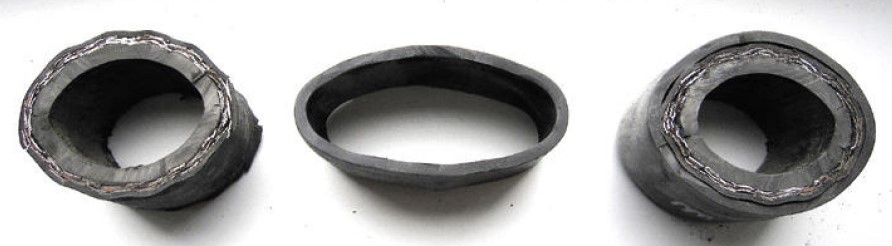 Seine Härte ist so optimiert, dass er einerseits über seine Wandung die Vortriebskräfte unbeschadet weiterleitet, aber andererseits sich so formschlüssig an die Betonoberfläche anschmiegt, dass er die Funktion als Dichtung erfüllt. Abb. 5 zeigt den konventionellen Hydraulikschlauch der Hydraulischen Fuge, in der Mitte den Dichtschlauch und rechts das Gesamtsystem des Hydraulikschlauchs mit aufgespanntem Dichtschlauch.