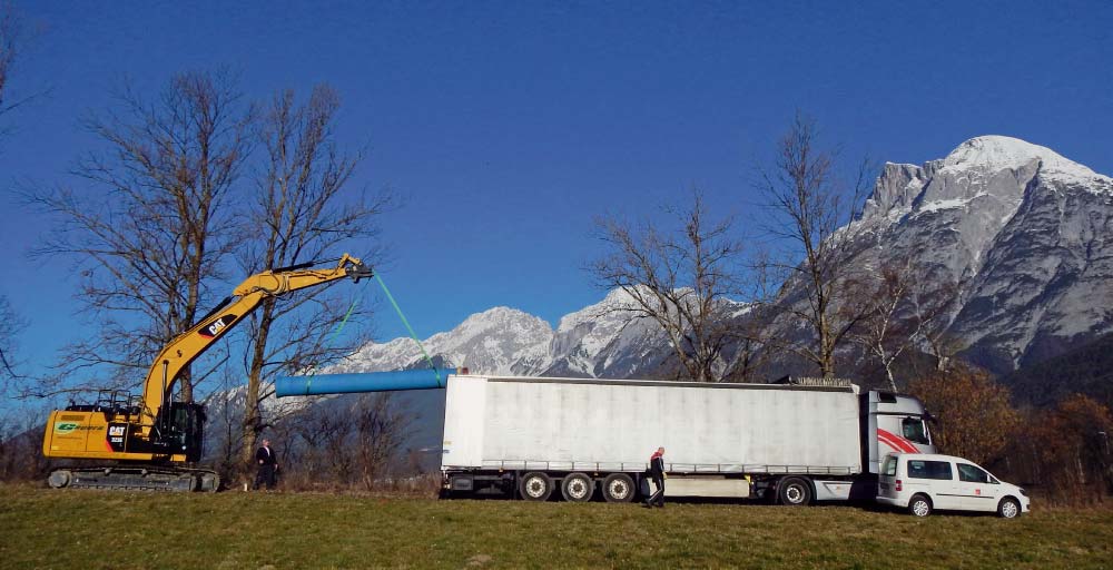 Bild 1: Anlieferung der duktilen Gussrohre für die Turbinenleitung des neuen Wasserkraftwerks am Kanzingbach (Tirol). [Foto: Tiroler Rohre GmbH - TRM]