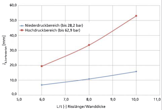 Bild 5: Erforderliche Bruchzähigkeit J0,2 in Abhängigkeit vom Verhältnis der Durchrisslänge zur Wanddicke für zwei Anwendungsbereiche. [Quelle: TIWAG]