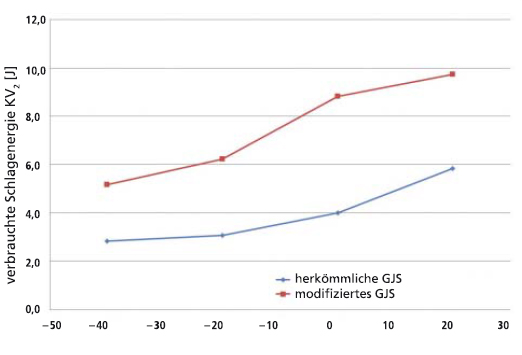 Auf den ersten Blick werden die großen Unterschiede der beiden Werkstoffe sichtbar. Während GJS 450-10 bereits ausgereizt bzw. überreizt ist, übertrifft der modifizierte Werkstoff die Anforderungen an die Bruchdehnung > 10 % deutlich, was aber zu Lasten der Zugfestigkeit und der technischen Streckgrenze geht. Auch die verbrauchte Schlagarbeit ist bei dem modifizierten Werkstoff über den gesamten untersuchten Temperaturbereich erheblich verbessert.