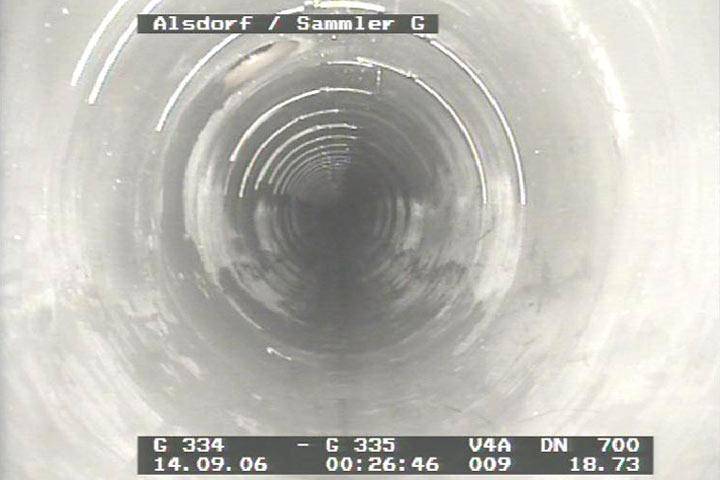 Auf einer Länge von etwa 10 Kilometern weist dieser etwa 20 Jahre alte Sammler ein außergewöhnliches Schadensbild auf: Insbesondere bei den Asbestzementrohren hat sich eine im Durchschnitt etwa 2 cm tiefe und 1,5 cm breite Rille gebildet, die sich wie eingefräst durch die Sohle zieht. "Die Ursache für diesen Schaden ist, trotz umfangreicher Nachforschungen und wissenschaftlicher Untersuchungen, ein bis heute ungeklärtes Phänomen und wird wohl ewig ein Geheimnis bleiben," erläutert Jürgen Neitzert vom Abwasserzweckverband. Vermutet wird die Einleitung eines hoch aggressiven Mediums, Zusammensetzung und Herkunft lassen sich jedoch nicht mehr ermitteln.