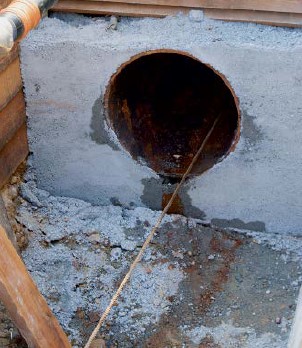 Der zwischen Altrohr und Neurohr verbliebene Ringraum wurde mit einem alkalischen Dämmer verfüllt, der nach Anforderung der SWM eine Schrumpfung/Wasserentmischung nach Abbindung von weniger als 1 Vol.-% und eine Druckfestigkeit von mindestens 1,0 N/mm2 nach 28 Tagen aufweisen musste.