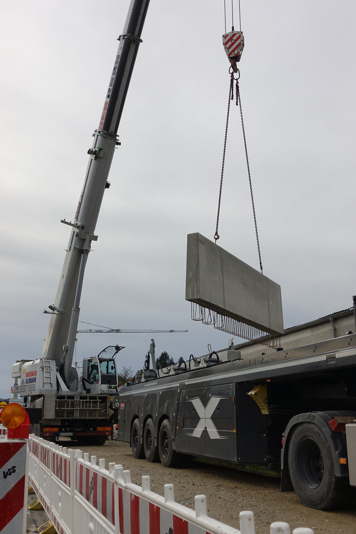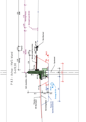 Damit waren die Voraussetzungen geschaffen, um darauf die über dem Gelände sichtbaren ein bis dreieinhalb Meter hohen Betonfertigteile zu platzieren und zu einer durchgehenden Hochwasserschutzwand zu verbinden. Unterbrochen ist diese Wand dort, wo Straßen, Werkszufahrten und die Eisenbahnlinie queren. An solchen Stellen wird die Lücke in der Wand im Ernstfall mit mobilen Verschlüssen in Form von Aludammbalken redundant (mit zwei Verschlussebenen) geschlossen. Die Rahmen dafür sind vorhanden, alle mobilen Bauteile werden ortsnah gelagert.