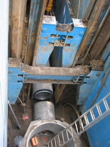 Mit dem Verlegerät, das der Bagger im Schnellwechselverfahren aufnimmt, konnten die Rohre schnell und sicher in die Baugrube eingehoben und in die bereits verlegten Rohre eingeschoben werden. Die konstruktiven Merkmale des Linearverbausystems trugen zu dem reibungslosen Ablauf bei.