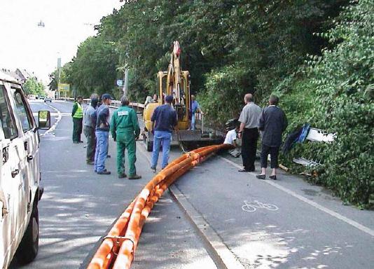 Auch innerorts bietet das patentierte "Schwerter Verfahren" eine Vielzahl von Einsatzmöglichkeiten, z.B. in engen Wohnstrassen mit wertvollem Baumbestand. Als besonders geeignet erweist sich das "Schwerter Verfahren" in allen sensiblen Bereichen, in denen eine konventionelle Leitungsverlegung entweder gar nicht oder nur mit ungleich höherem Kostenaufwand durchgeführt werden kann, z.B. auf Flughäfen, unter Autobahnen, Flüssen und Gleisanlagen oder bei besonders schwierigen Leitungskreuzungen anderer Versorgungsträger.