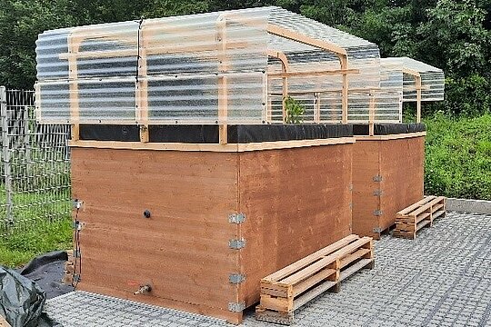 Im Projekt wurden Versuche zur Untersuchung des kapillaren Aufstiegs und der Versickerungsfähigkeit einer bestimmten Bodenzusammensetzung durchgeführt. Die Versuche fanden auf dem Gelände der INTEWA GmbH in Aachen statt. Der Versuch zur Untersuchung der kapillaren Aufstiegsrate erfolgte anhand zweier Lysimeter-Anlagen. Das eine System stellt hierbei das Demonstratorsystem mit einem verbauten DRAINMAX-Tunnel dar. Das andere System diente als Referenzsystem ohne Einbauten. Beide Systeme bestehen aus einer rechteckigen Holzverschalung mit den Innenmaßen 2,30 m x 1,49 m x 1,85 m (LxHxB) und einer Wanddicke von 2,7 cm (s. Abbildung 7).