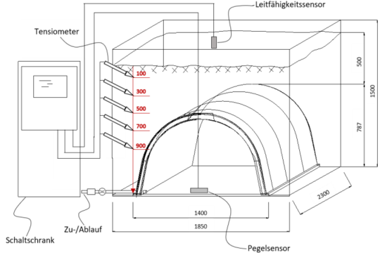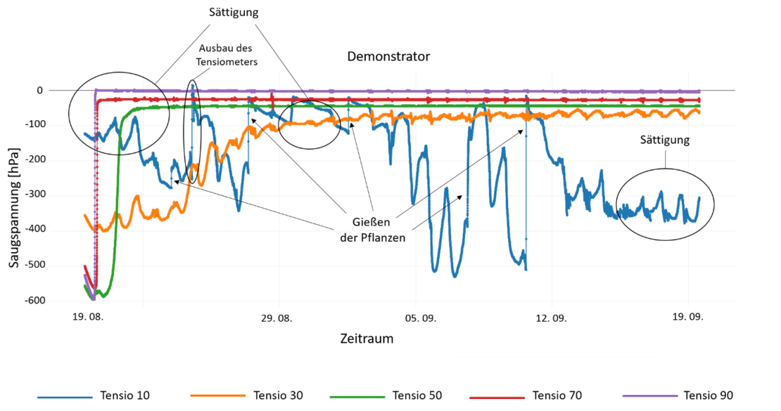 Anhand eines Kapillarversuchs wurde geprüft, nach welcher Zeit der kapillare Aufstieg die obersten Bodenschichten erreichen wird. Zu diesem Zweck wurden in verschiedenen Bodentiefen des Demonstrators Tensiometer zur indirekten Messung des Wassergehaltes eingebaut.
