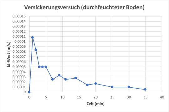 Bei dem trockenen Boden lag die Anfangsleitfähigkei bei 7,0E-5 m/s und sank bereits nach 5 Minuten auf 1,0E-5 m/s ab (Abb. 10a).