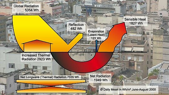 Dieser globale Wasserkreislauf ist in Abbildung 1 dargestellt. Er beinhaltet die Verdunstung von Wasser über den Ozeanen, welches daraufhin in Form von Niederschlag auf das Festland fällt. Dieses Niederschlagswasser kann anschließend ins Grundwasser versickern, in die Atmosphäre verdunsten oder in die Ozeane zurückfließen. Aufgrund zunehmender Urbanisierung und zunehmenden Versiegelung von 800 km² jährlich, wird dieser natürliche Kreislauf unterbrochen und kann somit zur Verstärkung von globalen Klimaveränderungen beitragen. Bei der Verdunstung von Wasser über die natürliche Begrünung beispielsweise, wird mit 1.888 Wh/m² und Tag die Umgebung gekühlt. (Abbildung 2).